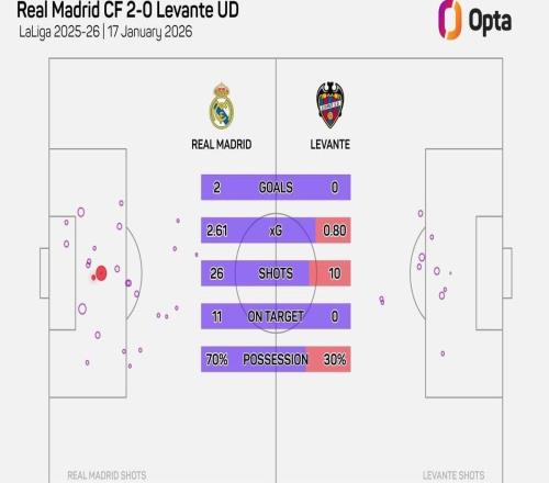 西甲第20轮,皇家马德里主场2-0击败莱万特,此役皇马完成了26次射门,这是有统计以来皇马主帅西甲首秀第三多。此...