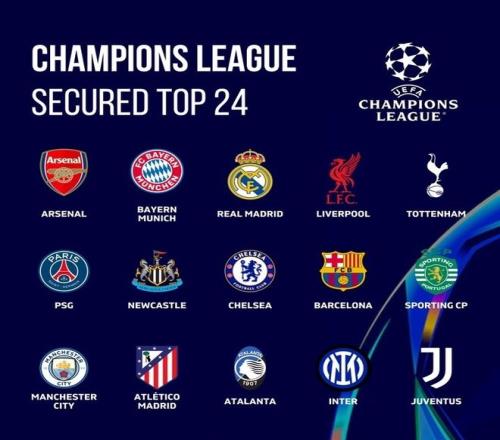 而至少确保附加赛的球队多达13队,分别是皇马、利物浦、热刺、巴黎、纽卡、切尔西、巴萨、葡萄牙体育、曼城、马竞、亚特兰大、国米、尤文